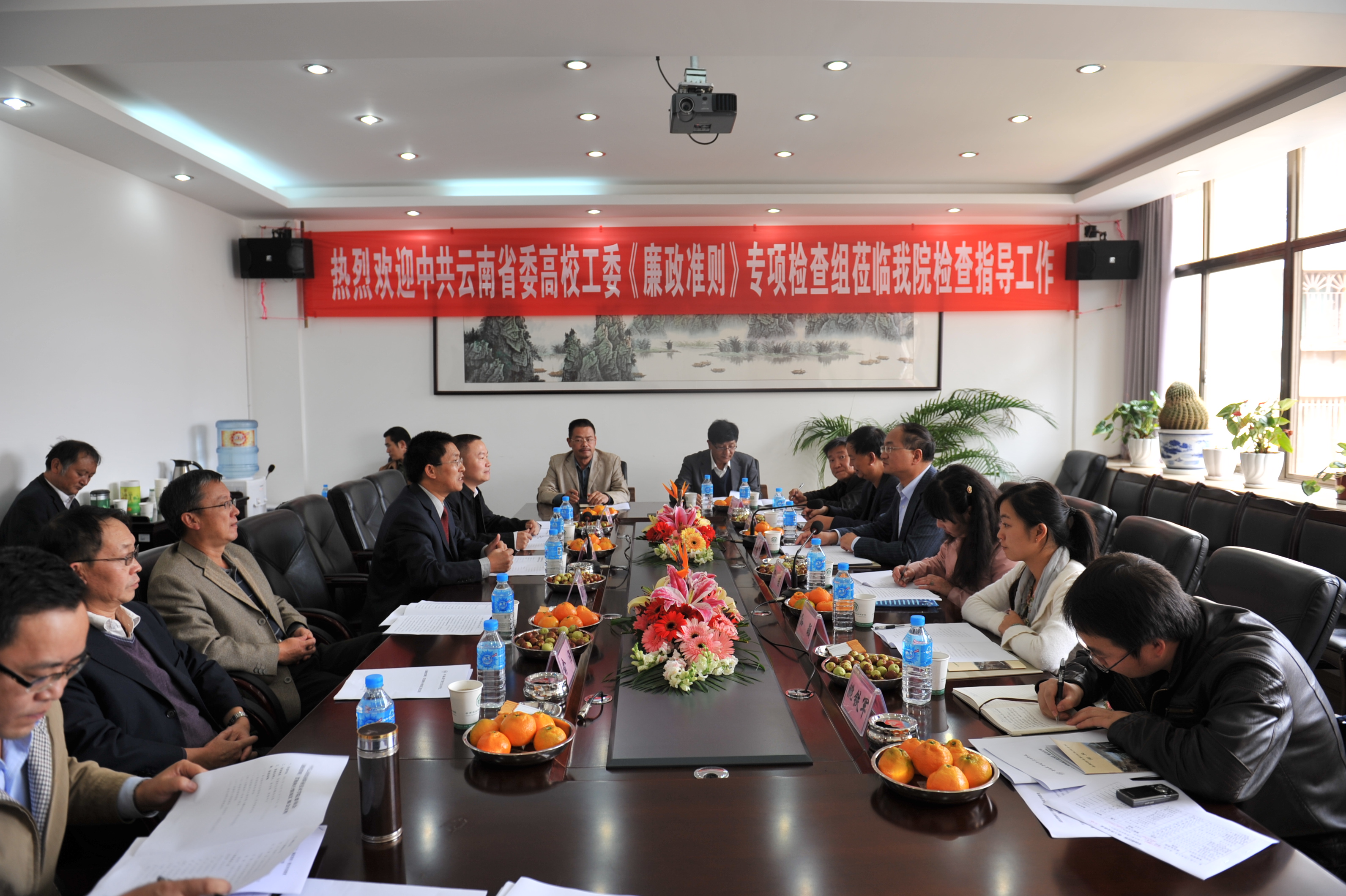 通知中心2011年10月21日下午,云南省委高校工委《廉政準則》專題檢查組蒞臨我院茭菱校區檢查指導工作。學院黨委書記崔金賦、院長彭志遠、黨委副書記趙剛、副院長趙莉、副院長俞浩出席,黨(院)辦主任凌軍、組織部長張建才、紀檢監察審計處處長李昆、副處長黃富金、園藝與園林工程系主任許邦麗、對外交流合作處處長許建民、基礎部主任董玉洲、宣傳部副部長蔡永生、計劃財務處副處長程春慧、后勤管理處副處長蘇誠等參加了會議,省委高校工委檢查組以李建宇為組長、何英富、卿茜、趙斌、孫顥、姚鐵軍等專家組成員對學院檢查指導。崔金賦書記主持會議。