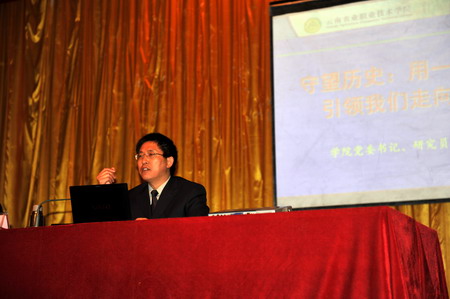 下午2:00,全體教職工在大禮堂認(rèn)真聆聽了黨委書記崔金賦同志作的《守望歷史用一種理念引領(lǐng)我們走向未來》的報(bào)告。崔書記全面細(xì)致而又自豪深情地回顧了我院一百零七年前——云南蠶桑學(xué)堂創(chuàng)辦的光輝歷程,我院與中國(guó)近現(xiàn)代歷史的重大事件、重要人物緊密關(guān)聯(lián)的光榮歷史,以及我院百年滄桑、風(fēng)雨兼程、薪火相繼,為云南的職業(yè)教育耕耘不輟、孜孜以求的可貴精神!崔書記強(qiáng)調(diào),雖然我院有悠久的辦學(xué)歷史和光榮的傳統(tǒng),2011年成功進(jìn)入了云南省六所省級(jí)示范性高職院校建設(shè)行列,但在教育改革的大潮中我們?nèi)稳幻媾R著新的挑戰(zhàn),需要全體教職工務(wù)必謙虛謹(jǐn)慎,需要樹立危機(jī)感和使命感,以更大的熱情,更高的責(zé)任感,更強(qiáng)的事業(yè)心,繼承百年務(wù)農(nóng)、耕耘不輟的光榮傳統(tǒng),為把我院建設(shè)成為面向東南亞、云南農(nóng)業(yè)教育的一面旗幟而努力奮斗!