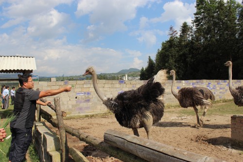 看到騰沖旅游業快速升溫,李朝智突然來了靈感,2009年,李朝智開始籌劃建設集觀光、娛樂、休閑、用餐為一體的農莊“駝中園休閑園”,他在園內開設餐館,把鴕鳥掌、鴕鳥內臟、鴕鳥血做成菜肴,同時把鴕鳥皮、鴕鳥蛋帶到廣州制作成皮鞋、皮包等旅游產品,“渾身是寶”的鴕鳥被全面利用起來。2012年,李朝智再次向騰沖社會保障局爭取到200萬元的特色養殖貸款項目,養殖規模進一步擴大,鴕鳥養殖自此正式走上正軌。
