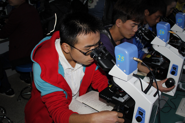 畜牧獸醫系王銳老師的實驗課《雞、兔血涂片制作與觀察;活細胞的觀察》共分為兩個環節。先是制作涂片,然后再在互動電子顯微鏡下觀察細胞的形態。每一個步驟都要求學生認真細致地嚴格按照實驗要求來進行。在王老師的指導下,同學們順利完成了實驗任務,收到了良好的效果。