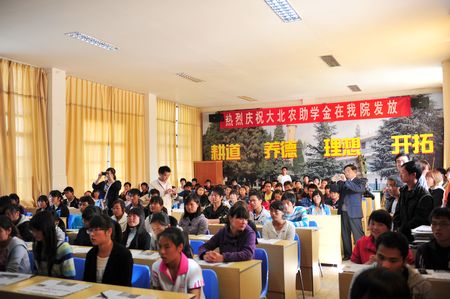 通知中心會議由畜牧獸醫系主任趙躍主持并講話,趙躍主任首先介紹了大北農集團十五年發展壯大為上市公司的成長歷程,大北農集團獨特而有活力的企業文化,強調人是企業最大的資源;介紹了我院畜牧獸醫系與昆明大北農農牧科技有限公司良好的校企合作過程,“大北農班”的同學在校企文化的熏陶訓練下,健康愉快地成長、成熟;介紹了大北農助學金資助大學生的目的:以興學助學為己任。趙主任強調大北農助學金在我院首次發放的意義,就是要資助既貧困又好學的學子順利完成學業,希望受助學子安心學習,用好成績回報企業、社會的關愛,學會感恩父母,感恩社會和學校!