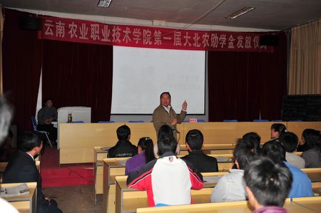 昆明大北農農牧科技有限公司經理岳寶在講話中贊揚我院悠久而光榮的辦學歷史,贊揚學院為社會培養了大批優秀的學生;介紹了大北農企業的使命:“科教興農,報國興農”,幫助農民擺脫貧困,走向富裕,實現真正服務三農的宗旨。岳寶經理指出大北農集團在云南農業職業技術學院第一次發放助學金,今后要每年都發放,而且發放的基數還會不斷增加。