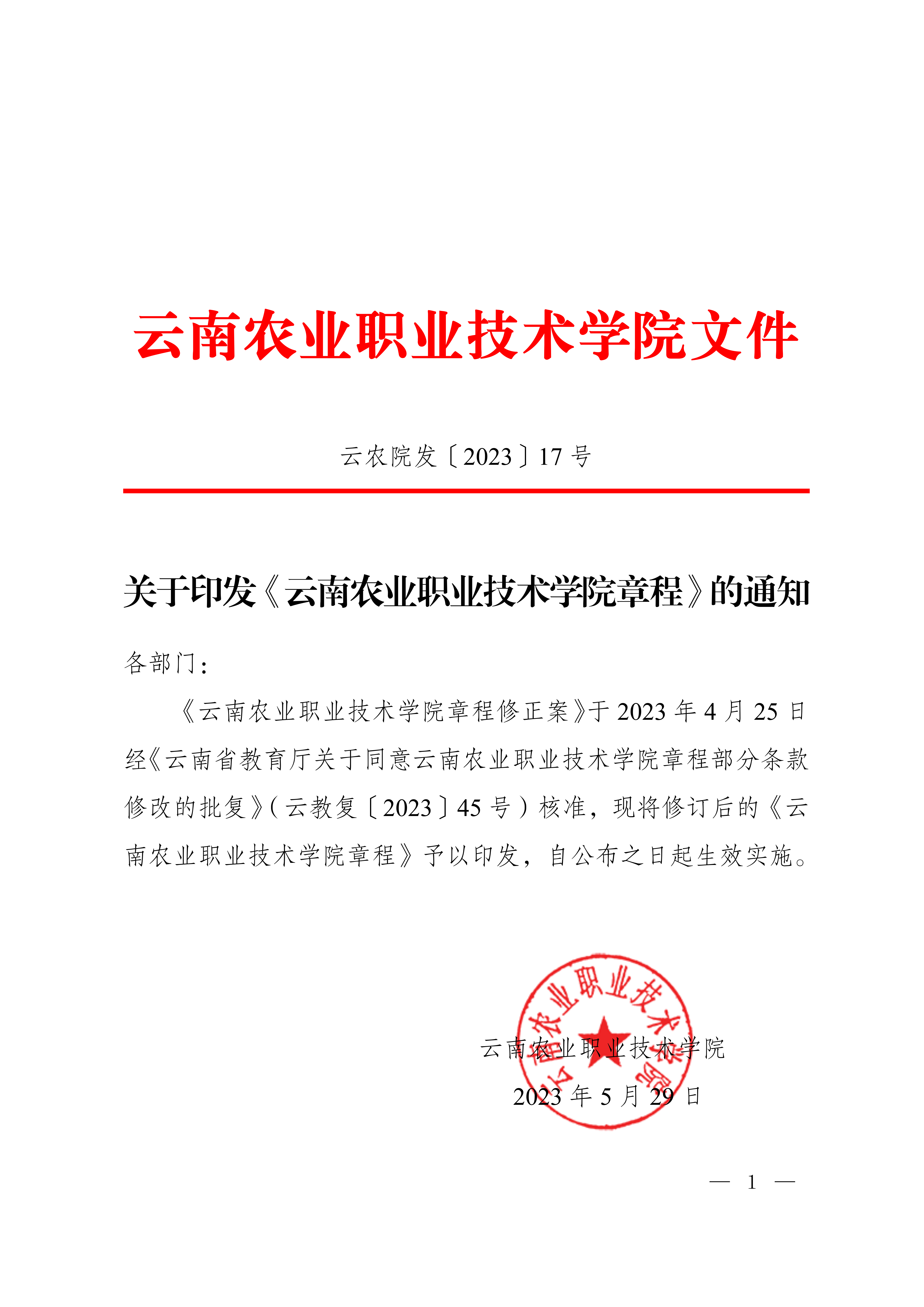 關(guān)于印發(fā)《云南農(nóng)業(yè)職業(yè)技術(shù)學(xué)院章程》的通知