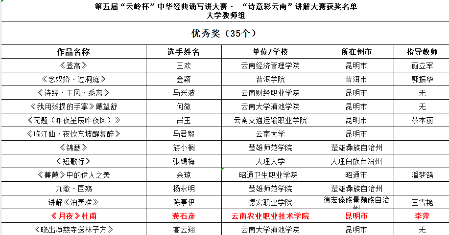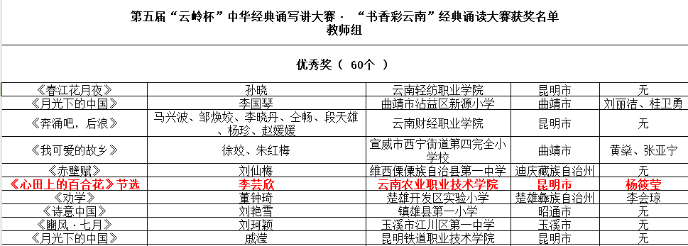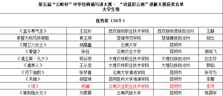 農(nóng)學(xué)與園藝技術(shù)學(xué)院學(xué)生顧李通的作品《詩經(jīng)·擊鼓》榮獲中華經(jīng)典誦寫講大賽大學(xué)生組講解類一等獎,其作品《我走在早晨的大路上》榮獲大學(xué)生組誦讀類二等獎;工程學(xué)院學(xué)生楊琪的作品《背影節(jié)選》榮獲誦讀類大學(xué)生組二等獎。李蕓欣老師的作品《心田上的百合花》榮獲教師組誦讀類優(yōu)秀獎、龔石彥老師的作品《月夜—杜甫》榮獲教師組講解類優(yōu)秀獎、云安產(chǎn)業(yè)學(xué)院學(xué)生楊斕的作品《氓》榮獲講解類大學(xué)生組優(yōu)秀獎。