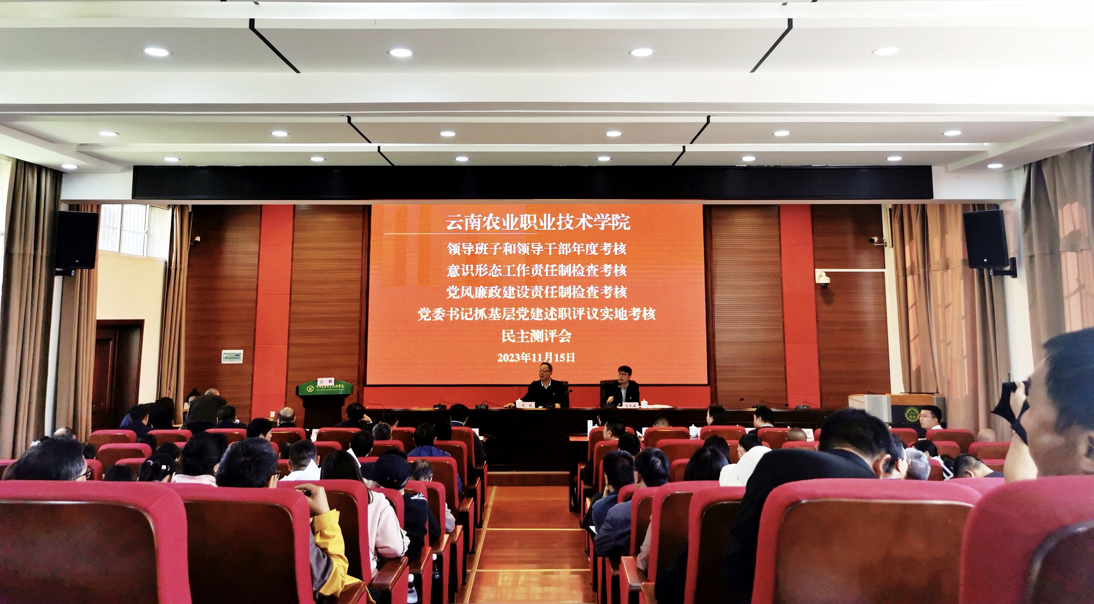 考核過程中,在小哨校區嘉銳階梯教室召開會議,進行總結述職和民主評議。會議由學院黨委副書記、院長陳太安主持。學院黨政領導班子成員、中層干部、黨代表、人大代表、政協委員、民主黨派人士、離退休老干部、一般干部和教職工代表等參加會議。