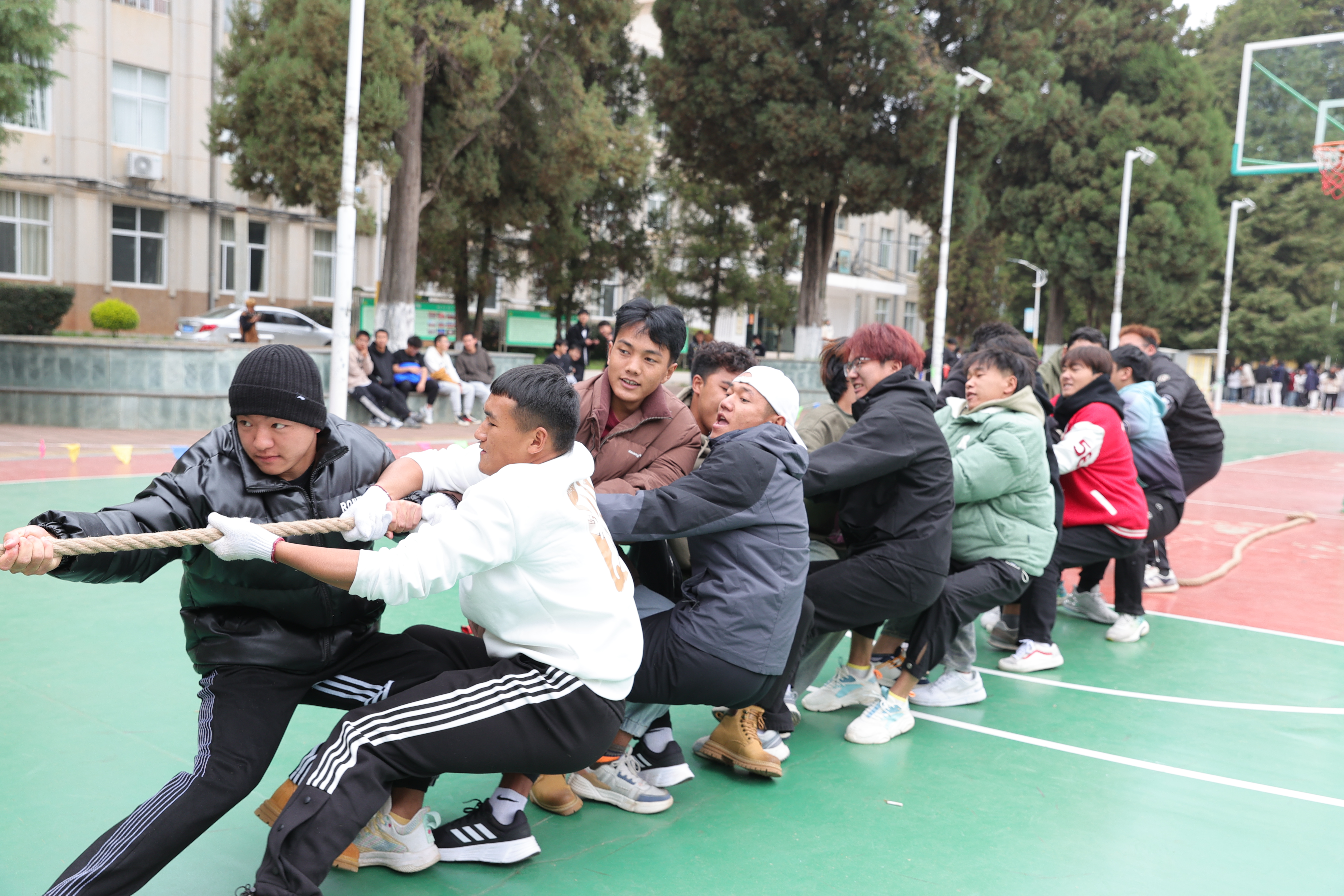 這是力量與團(tuán)隊(duì)精神的最佳展示!雙方隊(duì)伍全力以赴,緊握繩索,用盡全力向后拉。每一次的拉扯,都是對勝利的渴望和對挑戰(zhàn)的堅(jiān)持。汗水、呼吸、力量,都在這一刻凝聚,形成了一幅動人的畫面。