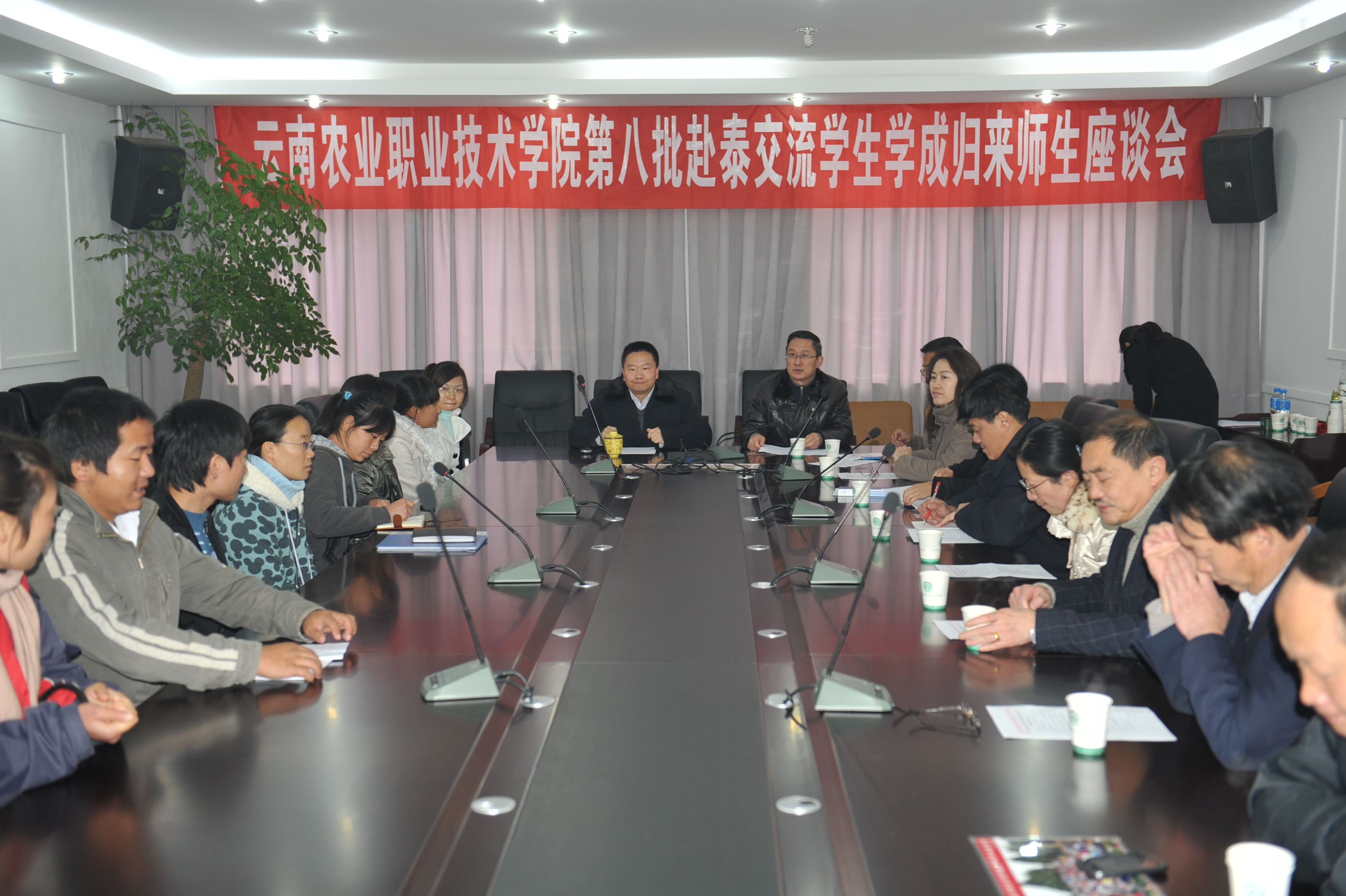 2011年12月15日,學(xué)院在小哨校區(qū)會議室舉行座談會,熱烈歡迎第八批赴泰國交流師生學(xué)成歸來,彭志遠(yuǎn)院長出席作重要講話。黨委副書記趙剛、趙莉副院長、俞浩副院長,對外交流與合作處處長許建民、黨(院)辦主任凌軍、學(xué)生工作處處長周誠、畜牧獸醫(yī)系黨總支書記錢林東、園藝與園林工程系黨總支書記唐世凱、生物工程系黨總支書記董文紅、系主任王孟宇、管理與信息工程系黨總支書記黎紅梅、系主任譚琳、對外交流與合作處副處長趙茜、黨委宣傳部副部長蔡永生等部門負(fù)責(zé)人,以及赴泰交流學(xué)成歸來的十余名學(xué)生代表出席了座談會。趙剛副書記主持會議。