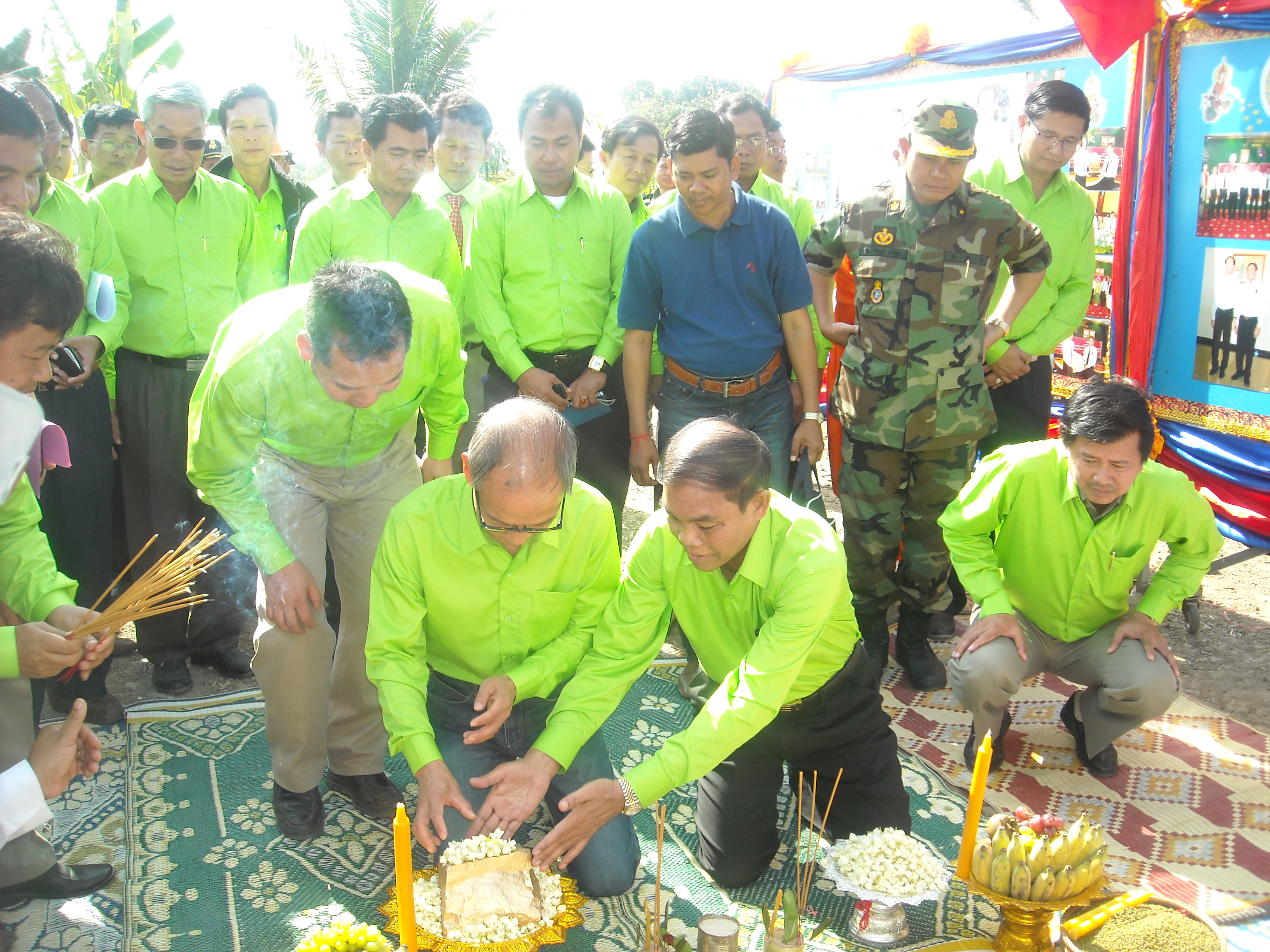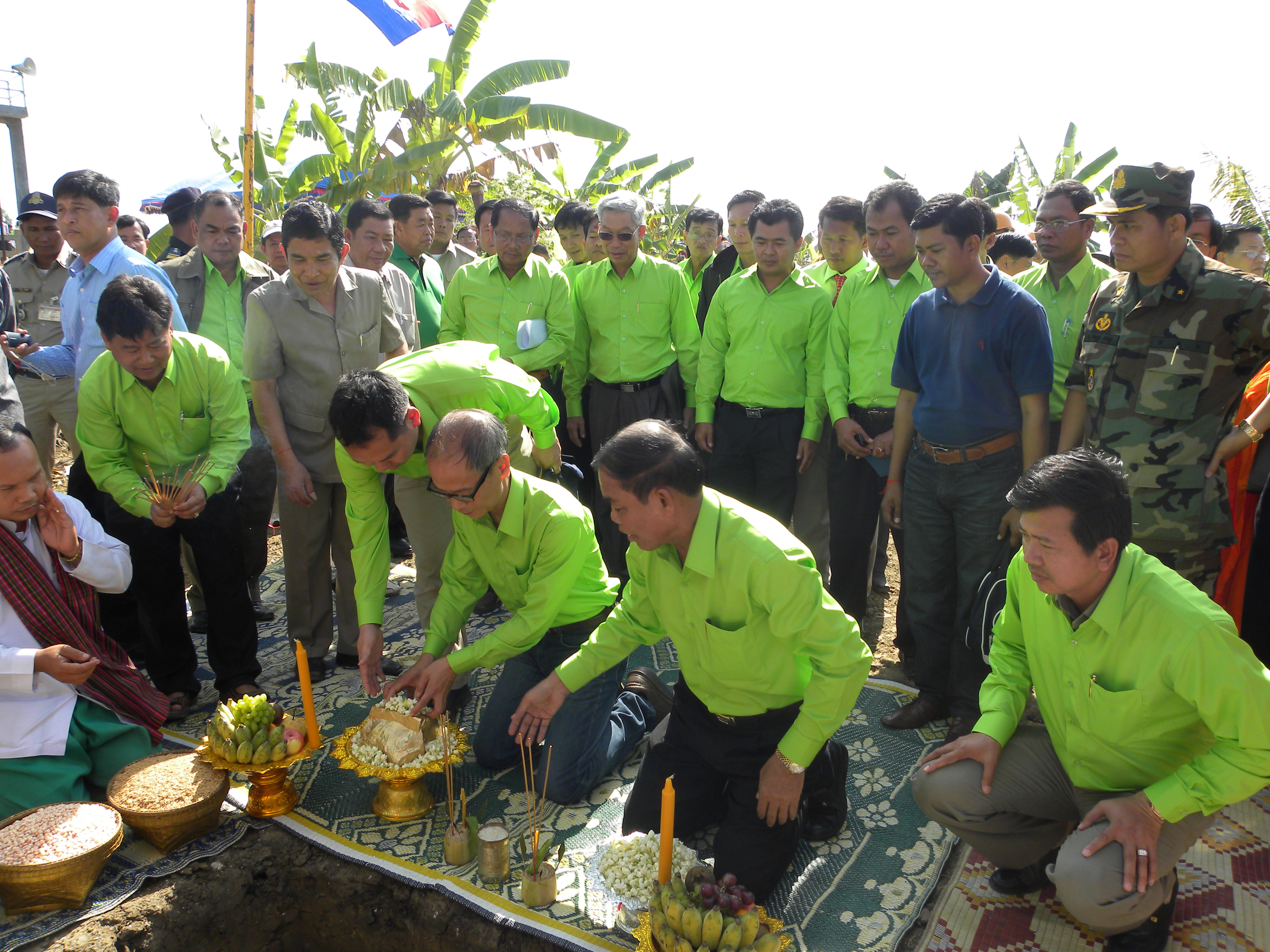 開工儀式后,按照柬埔寨王國的傳統舉行了奠基儀式,由翁恩省長與楊東云處長共同將奠基石拋入奠基坑,并向坑中撒入象征吉祥的茉莉花和象征豐收的稻谷、玉米、大豆、綠豆、花生等種子。“示范園”開工及奠基儀式的順利舉行,標志著該項目的實施已進入實質性的階段,為項目的建設和后期運行奠定良好基