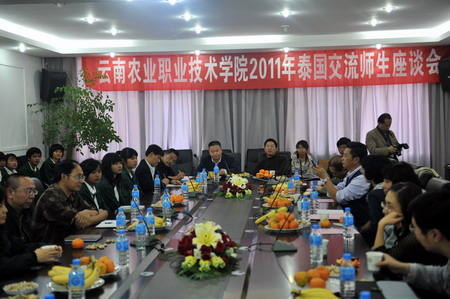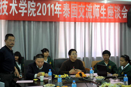 2011年10月25日下午,學院在小哨校區(qū)辦公樓二樓會議室召開第六批泰國留學師生座談會。黨委書記崔金賦、院長彭志遠、黨委副書記趙剛、院長助理田應華,以及黨(院)辦、教務處、對外合作交流處、宣傳部的有關負責人,畜牧獸醫(yī)系、園藝與園林工程系、生物工程系的負責人和留學生班主任,泰國18名留學師生等出席座談會。黨委副書記趙剛主持會議。