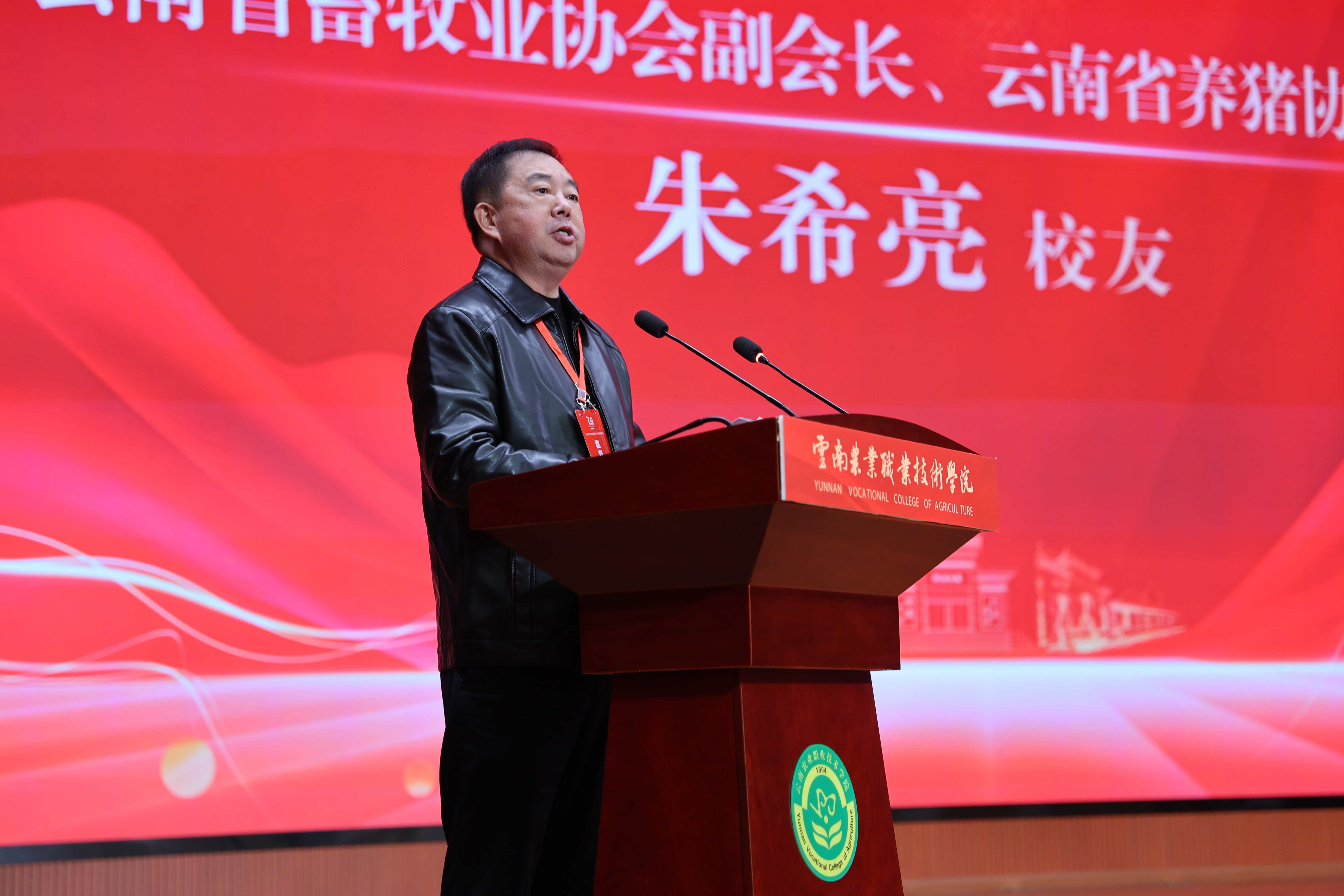 校友代表、云南省畜牧業(yè)協(xié)會副會長、云南省養(yǎng)豬協(xié)會副會長朱希亮發(fā)言,他表示,母校永遠(yuǎn)是最珍貴的青春記憶,學(xué)校艱苦奮斗、實(shí)事求是的精神賦予我們勇敢、樂觀的人生底色。對于學(xué)校取得的成就,作為校友倍感自豪。祝愿母校明天更美好,再創(chuàng)輝煌、再展宏圖!
