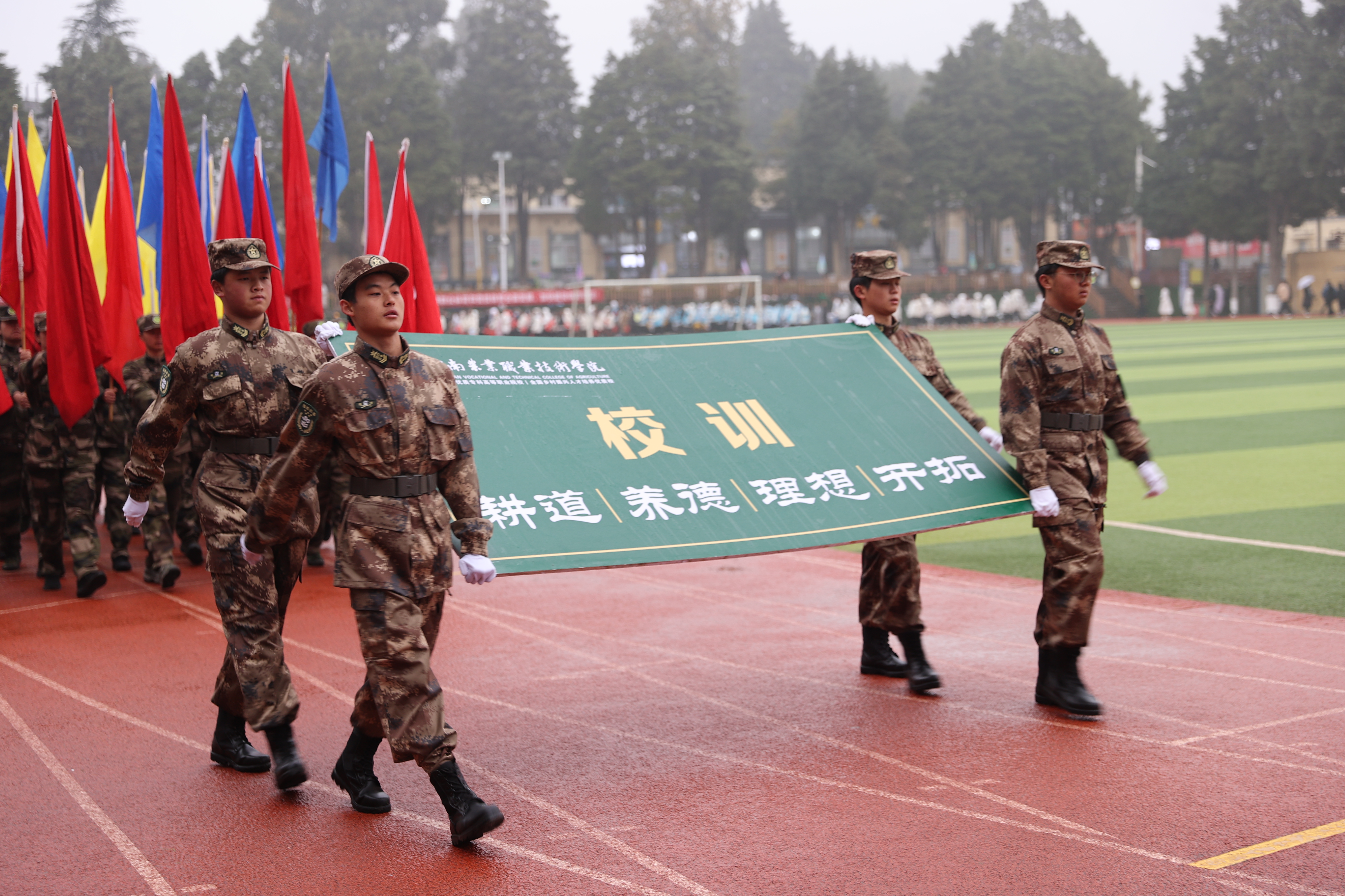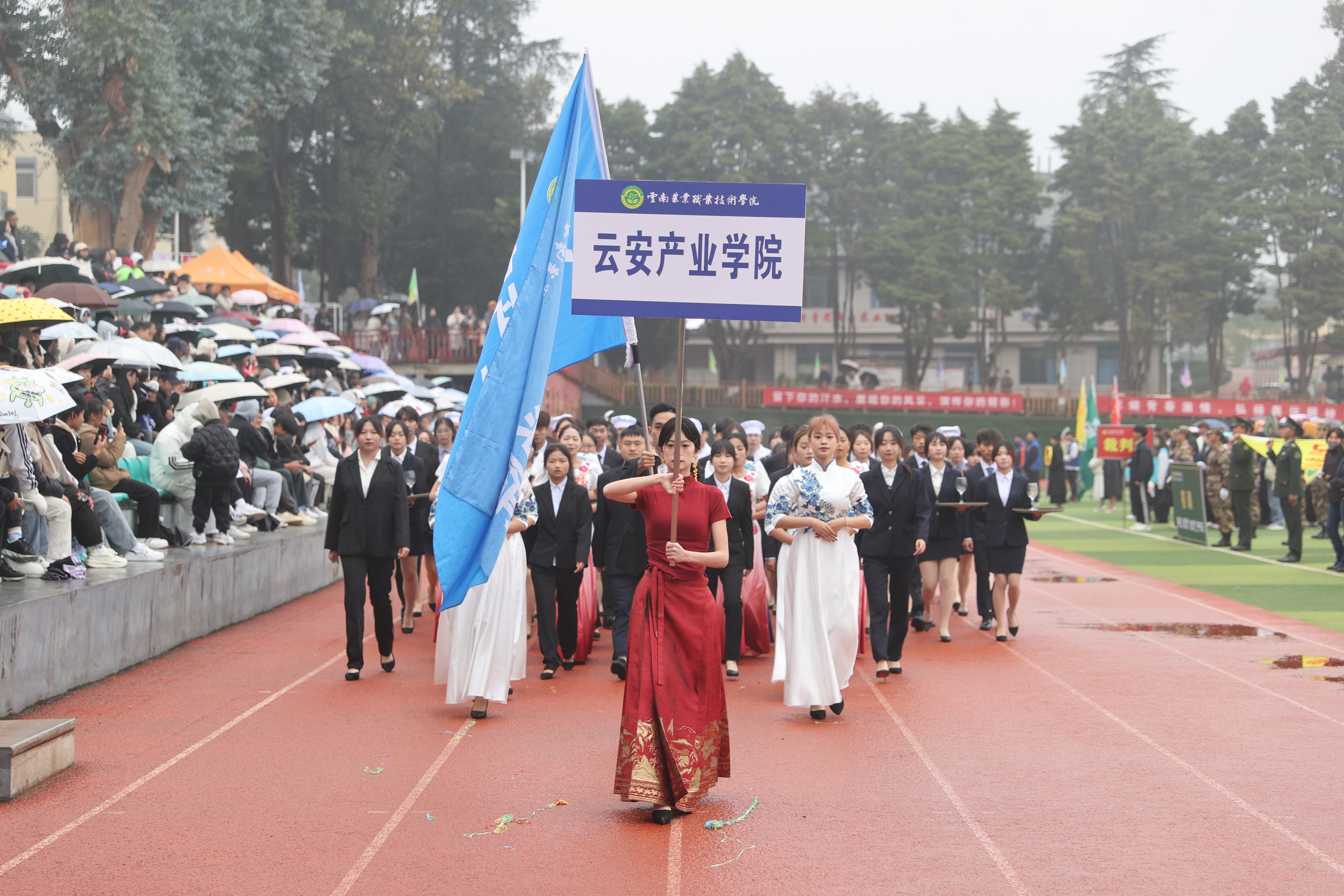 在激昂的進行曲中,開幕式拉開帷幕。校旗儀仗隊、校訓方隊、彩旗方隊、教工方隊、裁判員代表隊以及各二級學院代表隊依次入場。各方陣邁著整齊有力的步伐,以飽滿的熱情和昂揚的姿態(tài)步入會場,展現出農職師生積極向上的精神風貌,成為開幕式上一道活力四溢的風景線。