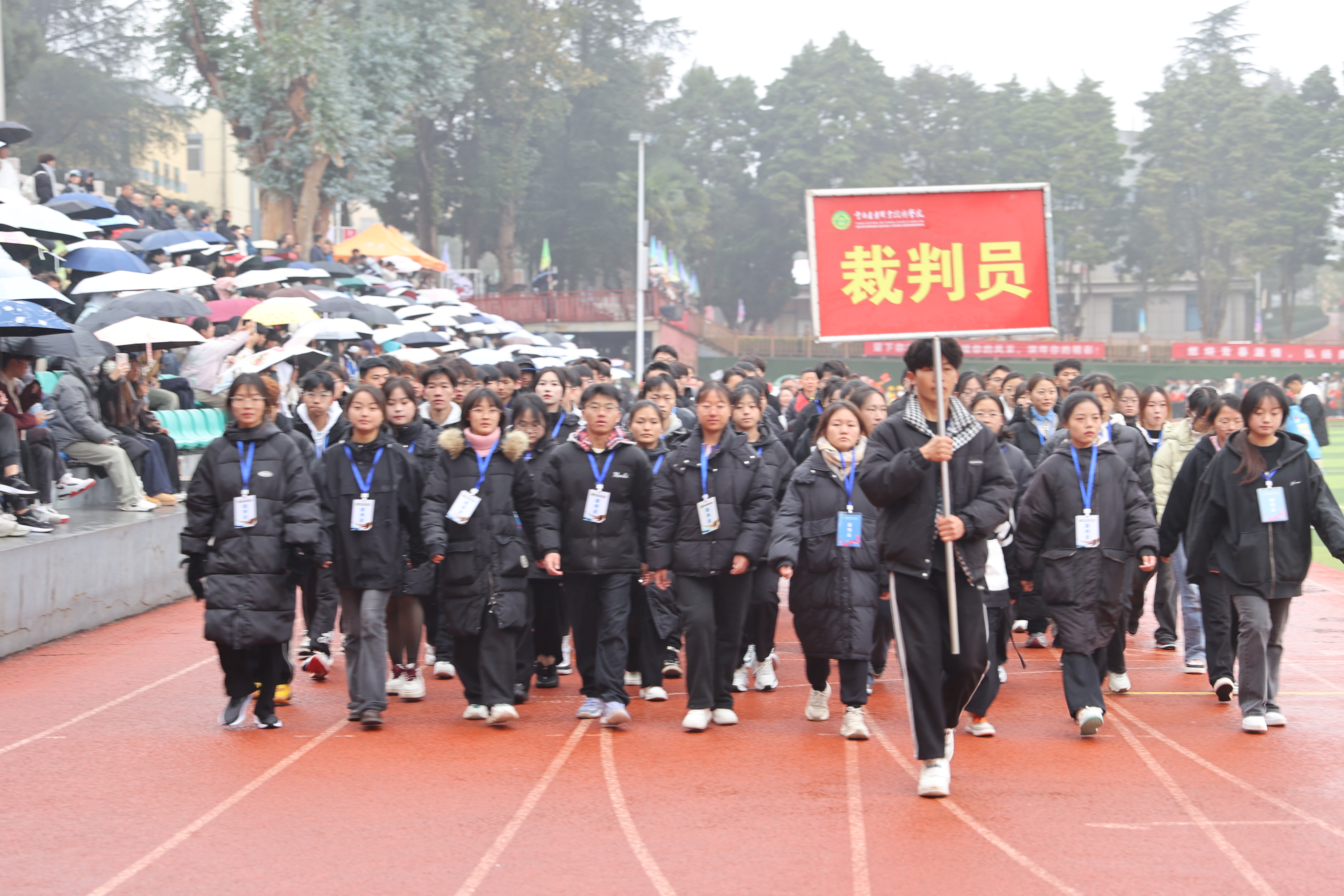 校長陳太安致開幕詞,他表示,學校歷來高度重視大學生體育運動與健康教育,不斷強化體育基礎設施建設、改善體育工作條件,積極推動群眾體育和競技體育發(fā)展,過去一年體育工作成績斐然,斬獲多項賽事榮譽,推動學校體育設施及教育水平不斷提升。陳太安校長希望參賽運動員秉持 “友誼第一、比賽第二” 的體育精神,在賽場上頑強拼搏、超越自我;裁判員嚴守競賽規(guī)程,公正裁決,確保比賽公平公正;工作人員恪盡職守,為賽事提供全方位、精細化的服務保障;觀眾文明觀賽,營造良好的賽場氛圍,共同書寫本次運動會的精彩篇章。