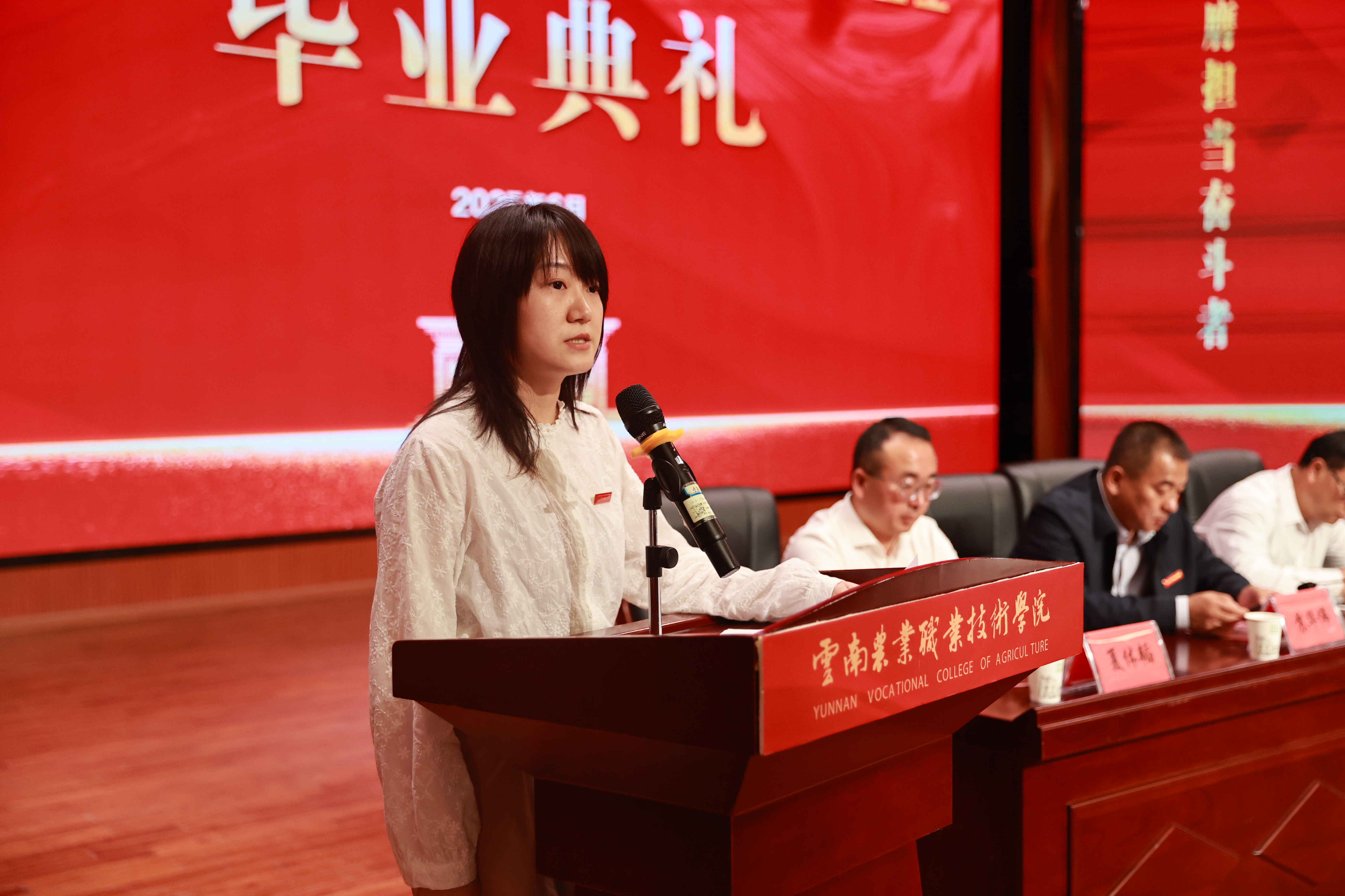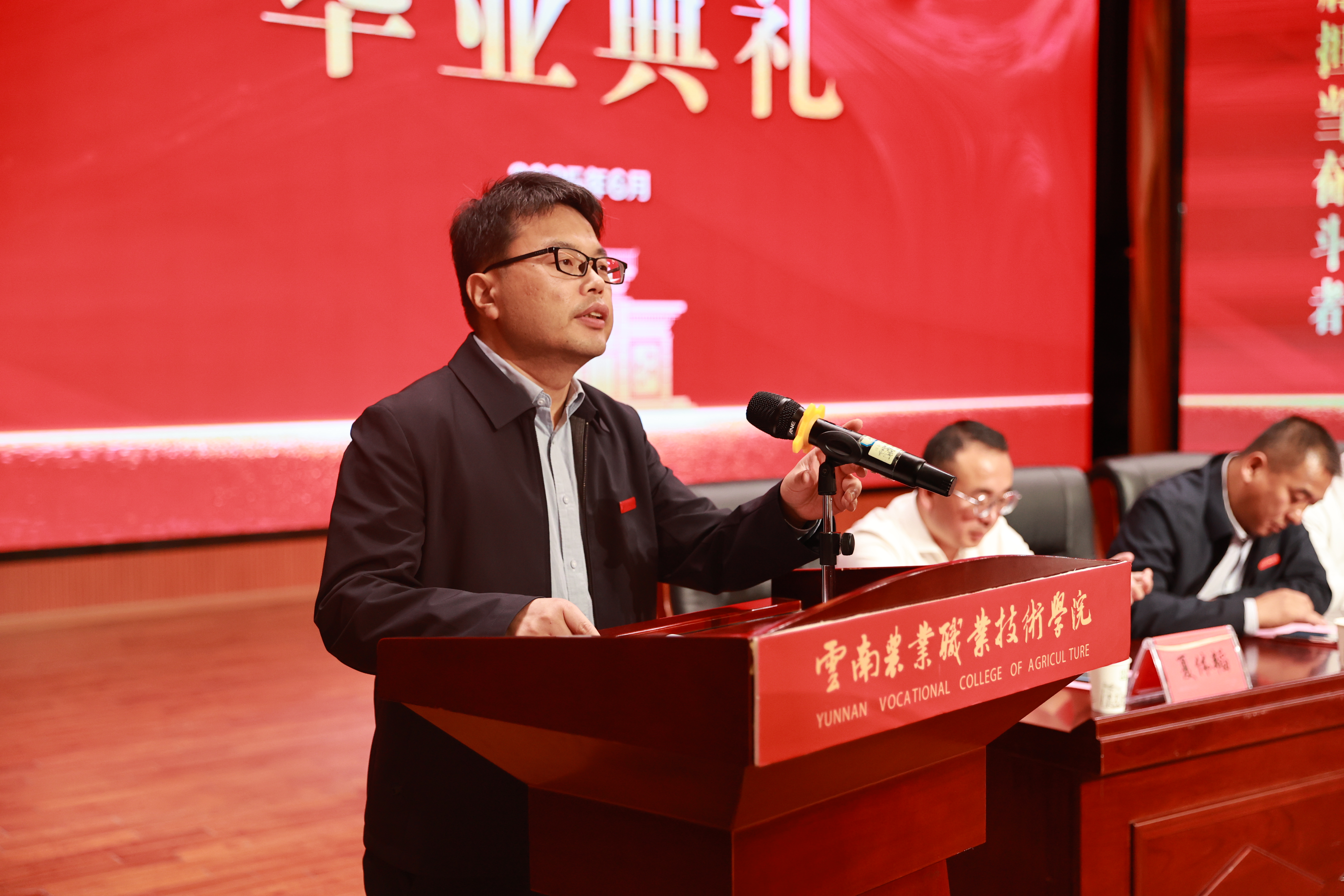 接下來(lái),陳太安校長(zhǎng)發(fā)表講話。他向畢業(yè)生們致以熱烈祝賀,對(duì)辛勤付出的教師表達(dá)誠(chéng)摯謝意。臨別時(shí)刻,校長(zhǎng)表達(dá)了對(duì)畢業(yè)生的殷切期望,希望畢業(yè)生們傳承云農(nóng)院精神,善良、正直、自律、有抱負(fù)、愛(ài)學(xué)習(xí),在新的征程上艱苦奮斗、甘于奉獻(xiàn)、守正創(chuàng)新、追求卓越。他對(duì)畢業(yè)生提出四點(diǎn)要求:一是立大志,以愛(ài)國(guó)理想照亮青春航向;二是明大德,以擔(dān)當(dāng)精神淬煉青春底色;三是成大才,以腳踏實(shí)地鑄就青春本領(lǐng);四是開(kāi)新局,以敢闖敢干引領(lǐng)青春航向。