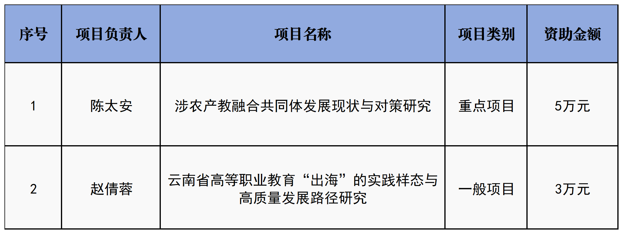 通知中心近日,我校陳太安校長、趙倩蓉老師申報的《涉農產教融合共同體發展現狀與對策研究》《云南省高等職業教育“出海”的實踐樣態與高質量發展路徑研究》等2項課題獲云南省職業教育研究院“學習闡釋《教育強國建設規劃綱要(2024–2035年)》精神科研課題”立項。