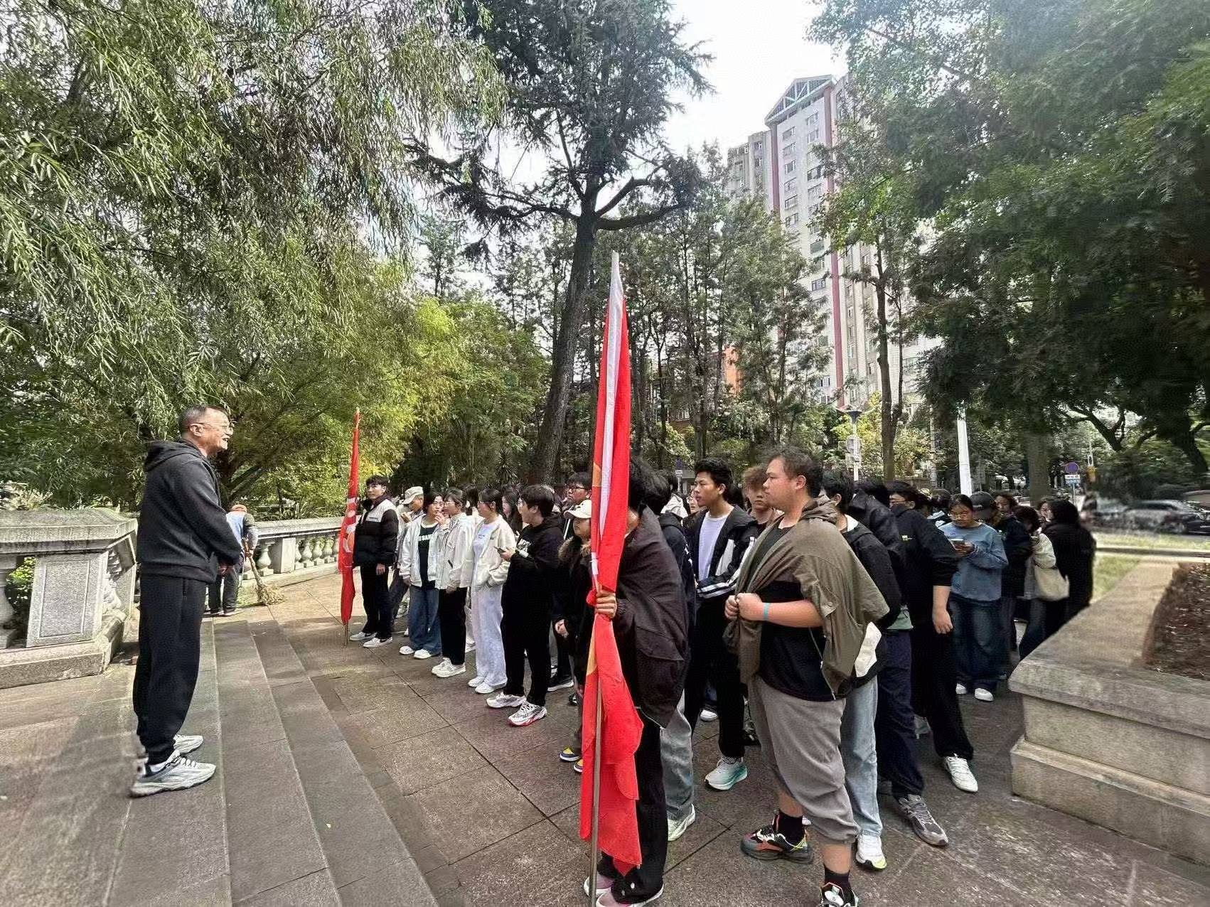 研學終點,師生們抵達大德寺雙塔,回溯1930年,我校在大德寺內省立高中農科班的基礎上恢復辦學,之后更名為昆華農業學校,辦學期間中共云南省委第一任書記王德三烈士在我校以教師身份為掩蔽開展革命工作,成為我校世代流傳學習的光輝榜樣。師生齊唱校歌,“耕道、養德、理想、開拓”的校訓在雙塔間回響。馮志宏教授寄語同學:“從大德寺到花莊河,再到小哨、茭菱,一代代云農職人把課堂立在田野、把論文寫在大地,希望你們把今天的感動變成明天的行動。”