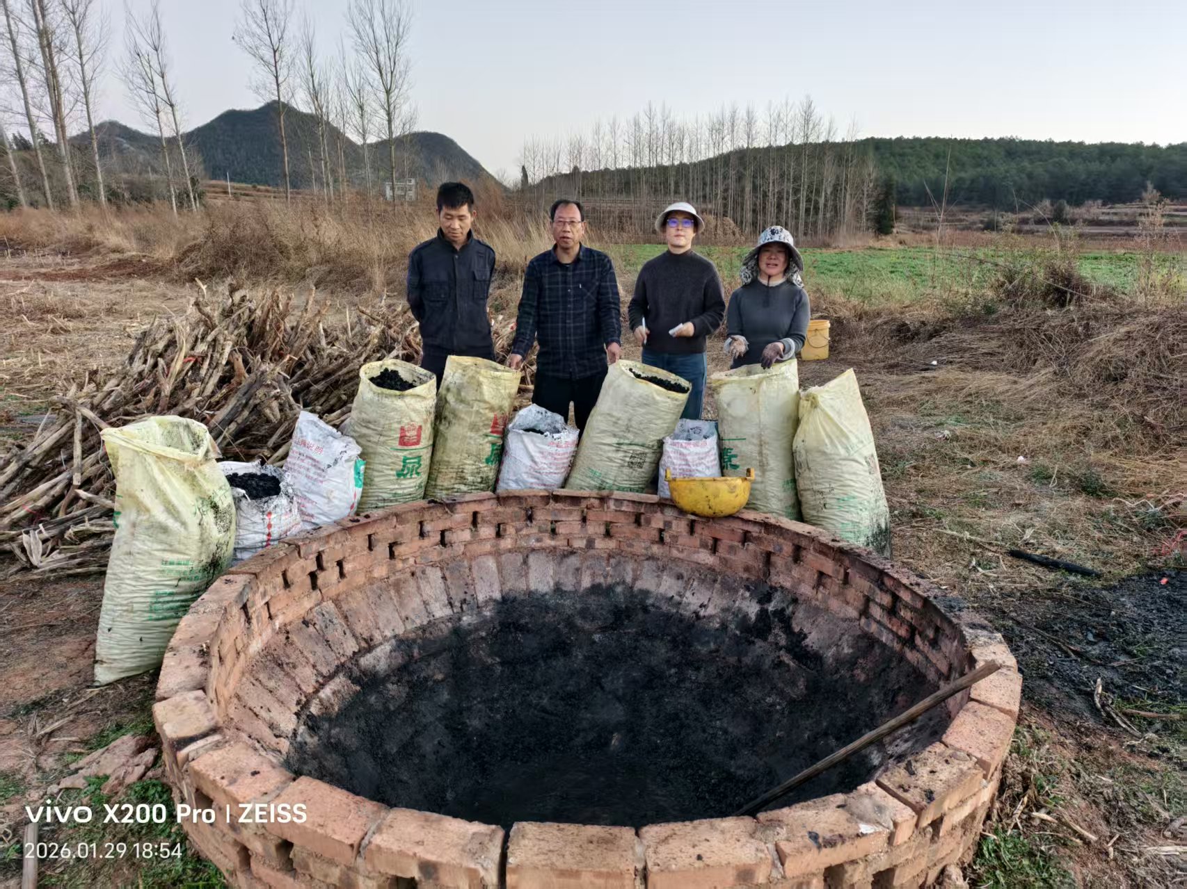 活動針對當地烤煙秋收后秸稈處理難題,開展秸稈集中焚燒示范。秸稈焚燒成生物炭后還田,改善土壤團粒結構從而改良土壤,以實現“三化”(減量化、無害化、資源化)利用。冬末的雷營村寒意未消,廣袤的田地里,一堆堆煙稈匍匐著、簇擁著,似乎比其他地方的煙稈更粗大,有泡水后曬干的,成深灰色;有堆捂后曬干的,成黑色;有自然風干的,成斑白色。田邊地角是一座先前建設好的、由紅磚砌成的特殊窯爐,這便是科技特派員團隊自主設計并建造的火焰幕磚窯。這次活動不但要焚燒完這片田地里的秸稈,還要分別取樣回去做出研究分析。