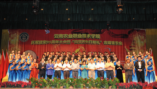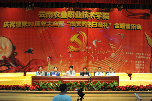 6月20日至21日,由中共云南農業職業技術學院委員會主辦,黨委辦公室、黨委宣傳部、黨委組織部承辦的慶祝建黨九十一周年大會暨“向黨的生日獻禮”合唱音樂會分別在小哨校區和茭菱校區禮堂隆重召開。學院黨委書記崔金賦、黨委副書記趙剛、副院長趙莉、副院長俞浩、院長助理田應華出席,學院中層領導干部、兩校區教職工,544名中共預備黨員等一千余人參加了慶祝大會。俞浩副院長主持大會。