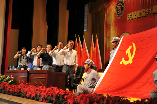 在新黨員宣誓儀式上,黨委辦公室主任凌軍帶領544名預備黨員面對黨旗莊嚴宣誓;老黨員與新黨員一起重溫入黨誓詞。