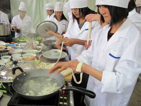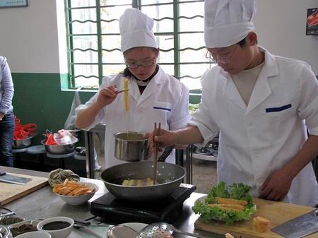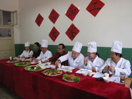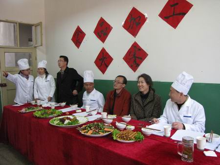 上午,34組選手分6組依次進入比賽現場,在為他們準備好了原料及加工器具的爐灶前開始比拼!選手們身著統一的白色廚師服,或雕刻花朵,或片魚切肉;或刀工了得,或小心分割;或大火快炒,或小伙慢燉。一時間,煎炸燉炒、麻辣香甜,各色技藝、各種味道精彩呈現!大理海稍魚、蘭州炒面片、川味啤酒鴨、特色兩吃魚、河口菜包等三十多道美味一一呈現在錢林東書記帶隊的評審團和趙莉副院長、馮志宏部長、董玉洲主任等特邀嘉賓面前時,有的老師不禁贊嘆“比有些專業廚師還做得好吃”,“沒想到我們的學生還有這么漂亮的一手”!