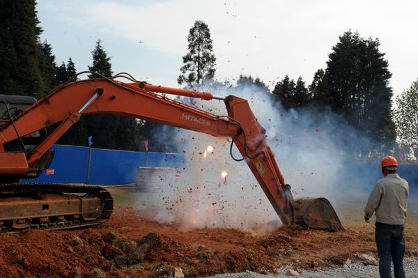 在黨委書記崔金賦宣布“項目正式開工”!在熱烈響亮的炮竹聲中,挖掘機挖下了工程項目的第一鏟土。(黨委宣傳部供稿)