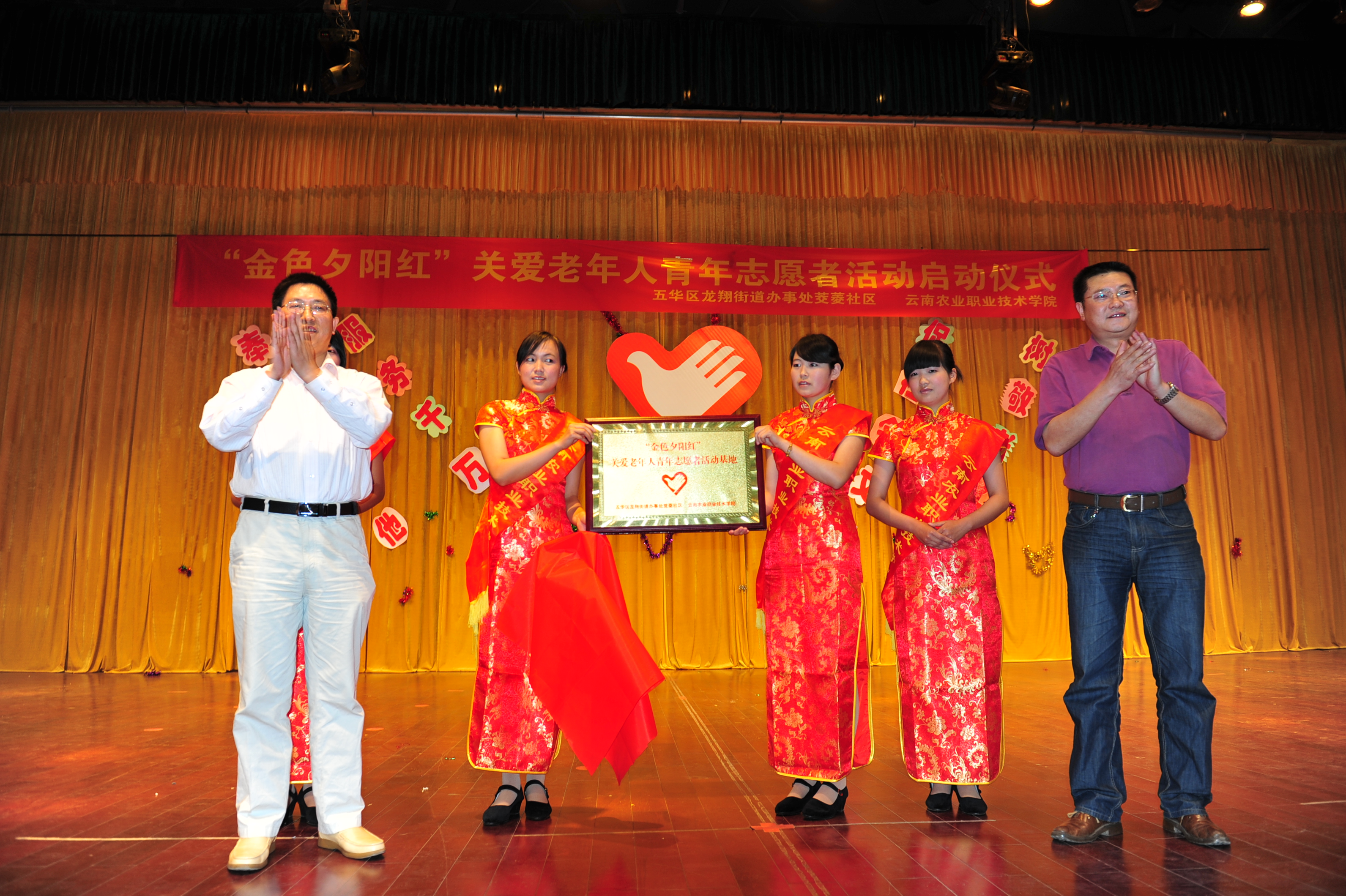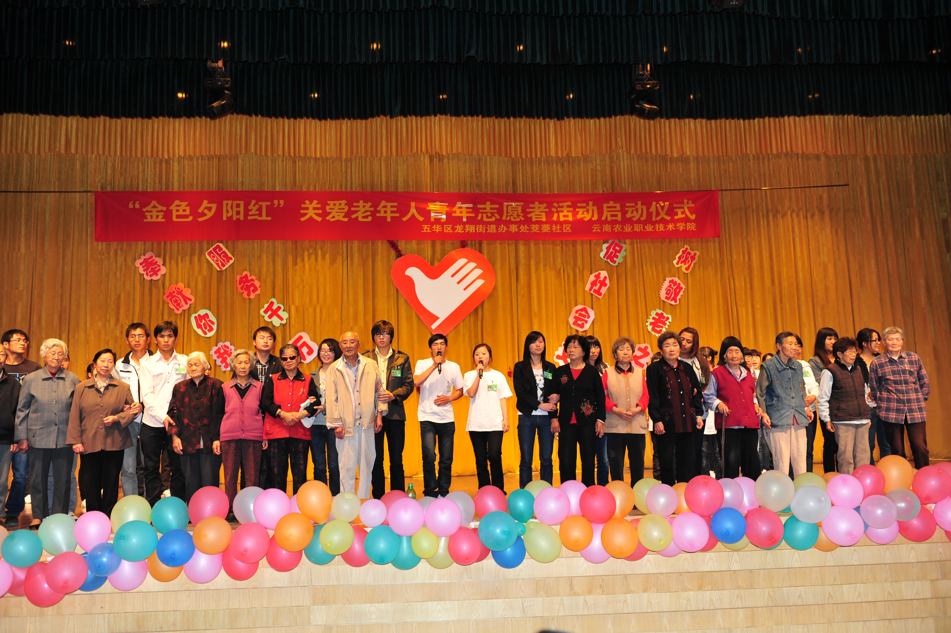 2011年5月5日下午1:00,五華區(qū)龍翔街道辦事處“金色夕陽紅”關(guān)愛老年人青年志愿者活動啟動儀式在我院茭菱校區(qū)禮堂隆重舉行。此次活動由云南農(nóng)業(yè)職業(yè)技術(shù)學(xué)院黨委宣傳部、共青團云南農(nóng)業(yè)職業(yè)技術(shù)學(xué)院委員會與五華區(qū)龍翔街道辦事處茭菱社區(qū)聯(lián)合舉辦。學(xué)院黨委書記崔金賦、黨委宣傳部馮志宏部長、學(xué)生工作處周誠處長、學(xué)院團委書記鞏佳老師,五華區(qū)龍翔街道辦事處及茭菱社區(qū)的領(lǐng)導(dǎo)出席了啟動儀式,茭菱社區(qū)的70位老人及我院的青年志愿者參加此次啟動儀式。